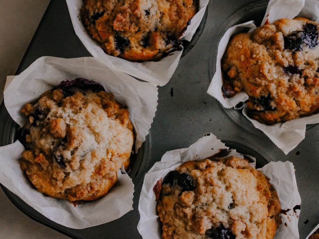 - Distribute batter evenly into lined muffin tins, filling cups about 2/3 full. Top with crumb topping.